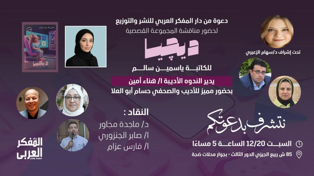 يستضيف دار ومنتدى المفكر العربي، مساء السبت المقبل الموافق 20 ديسمبر، أمسية أدبية لمناقشة المجموعة القصصية «ديچيا» للكاتبة ياسمين سالم، وذلك بمشاركة نخبة من الأدباء والكتاب والمفكرين والمثقفين والإعلاميين.